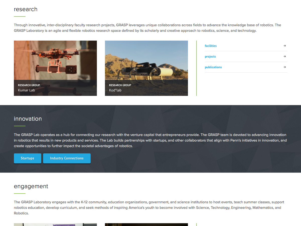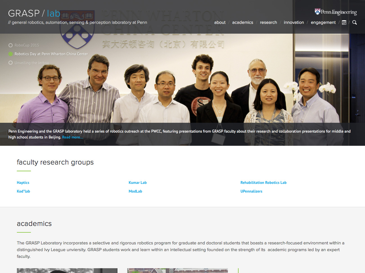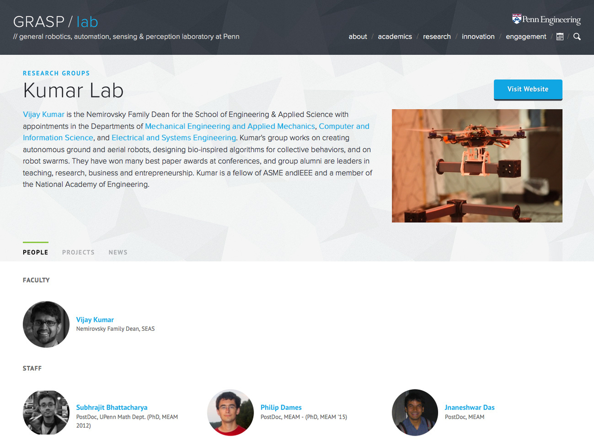 The GRASP Laboratory at the University of Pennsylvania is an interdisciplinary lab dedicated to research and education in robotic and intelligent systems consisting of approximately one hundred faculty, staff, and graduate students.